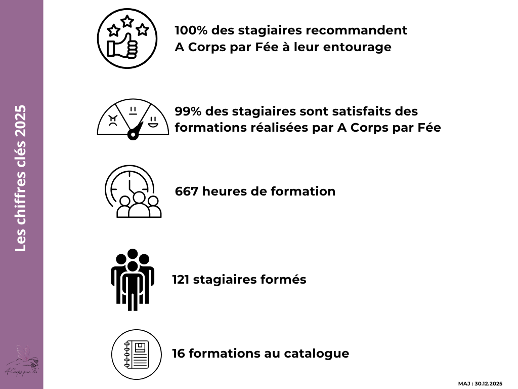 A Corps Par Fée est un organisme de formation créé par Nathalie Jarousse, hydrothérapeute et formatrice diplômée, qui propose des formations en massage et bien-être. Les formations se déroulent à Chadrac (43) à côté du Puy-en-Velay ou chez le demandeur dans toute la France, les DOM et à l’étranger.